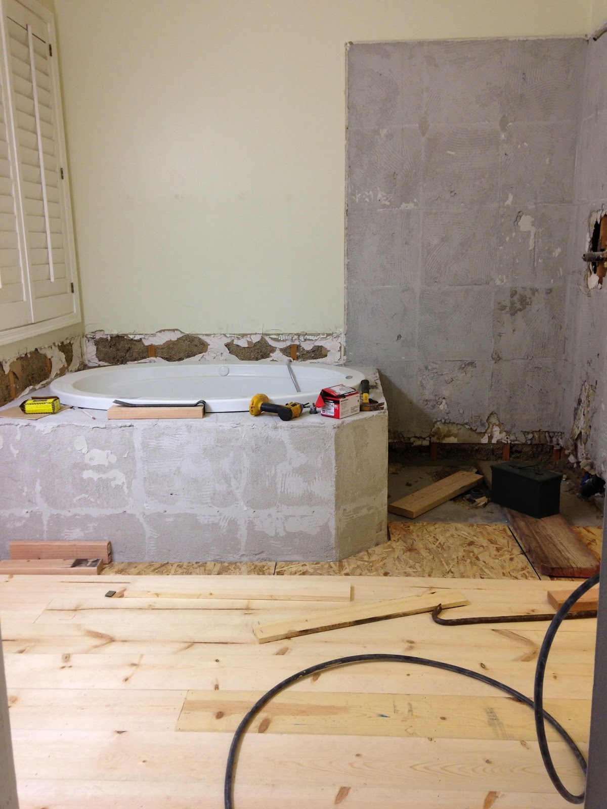 You can see in this next photo, the plywood floors and wood planking. We used the tub as leverage to push the planks together in my bathroom and then stapled them to the plywood. We used 1 1/5" 18 gauge staples which ended up being the perfect length.